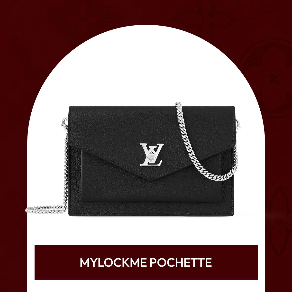 กระเป๋า Pouch ทรงฝาผับ รังสรรค์ขึ้นจากหนังลูกวัวที่มีความนุ่มหยุ่น โดดเด่นด้วยดีไซน์อันเป็นเอกลักษณ์คล้ายซองจดหมาย ประทับด้วยตัวล็อกอักษรย่อ LV สีเงินดูหรูหรา เข้ากับสายโซ่ยาวสีเดียวกัน แต่ตัดกับตัวกระเป๋าสีดำสนิทได้อย่างลงตัว จะสะพายไหล่เก๋ ๆ หรือสะพายเป็น Cross-Body เพื่อความคล่องตัวก็ได้